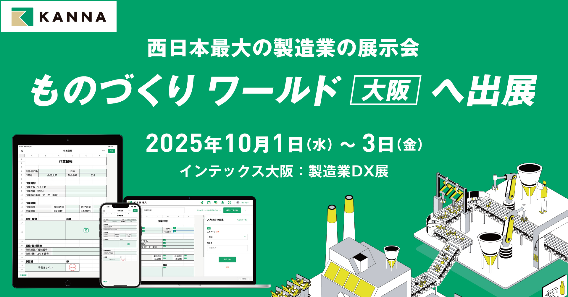 株式会社アルダグラム(本社:東京都港区、代表取締役:長濱光、以下、アルダグラム)が提供する現場DXサービス「KANNA(カンナ)」は、2025年10月1日(水)から3日(金)に、インテックス大阪で開催される「第28回 ものづくり ワールド [大阪]」に初出展します。